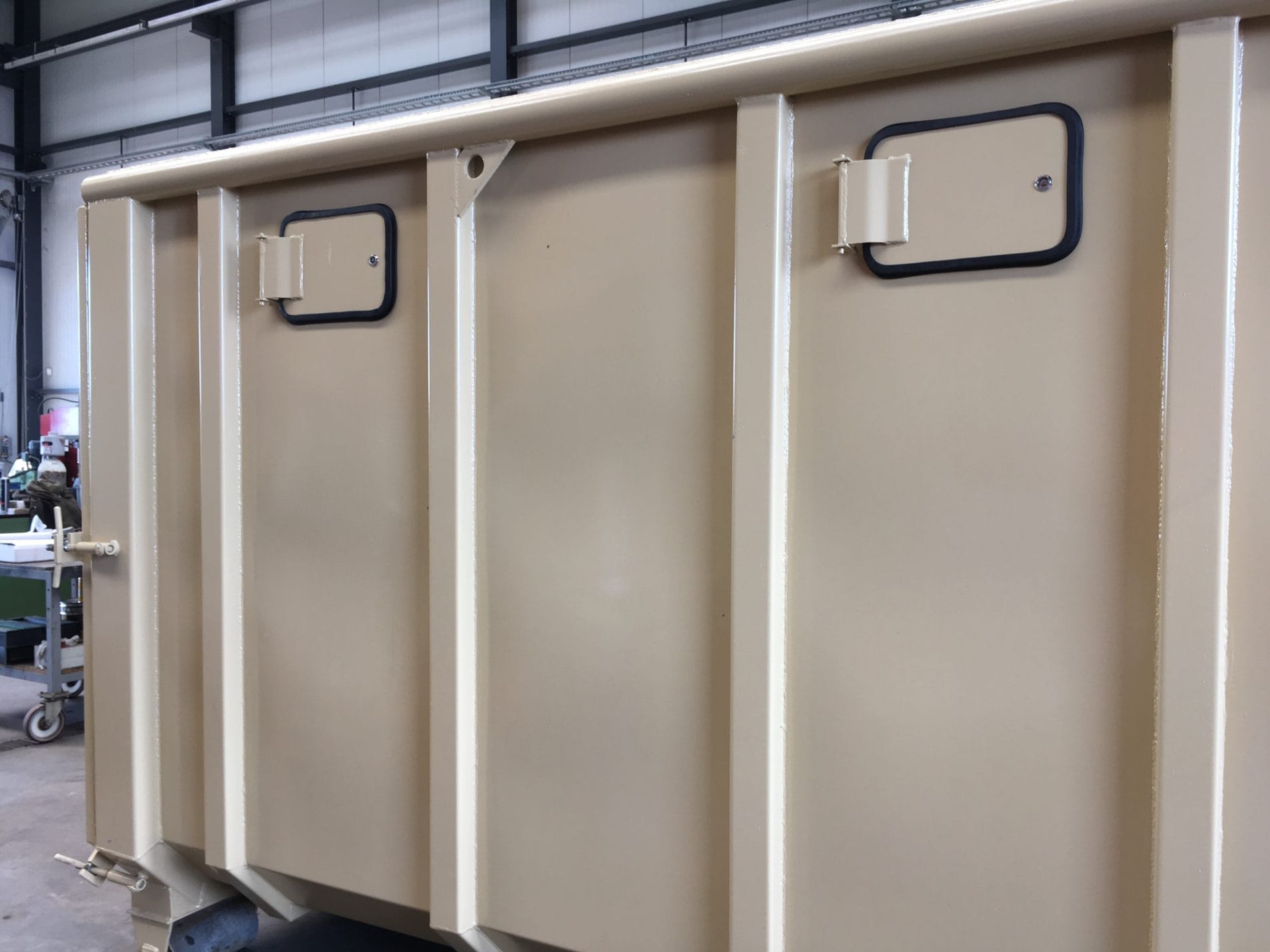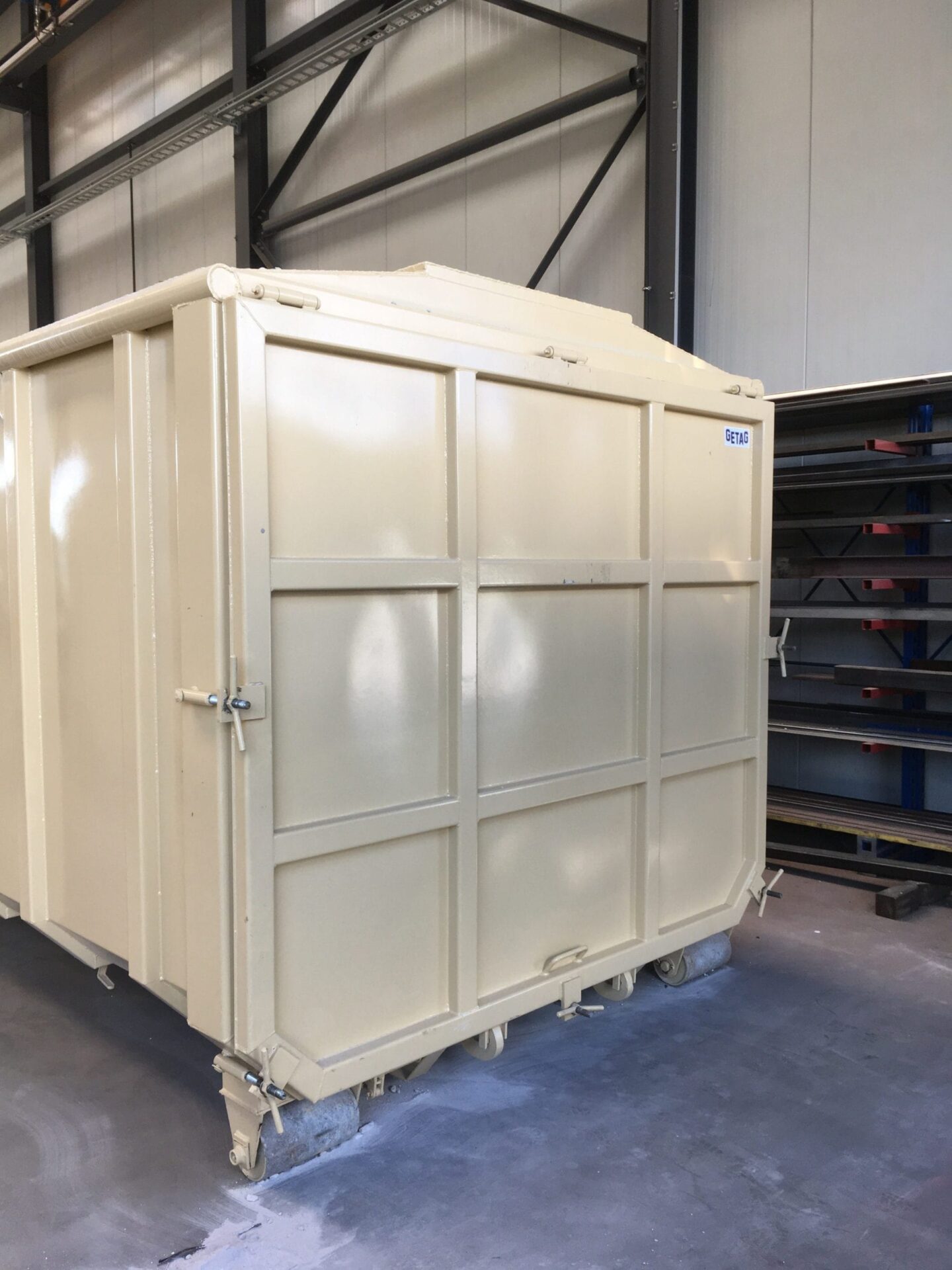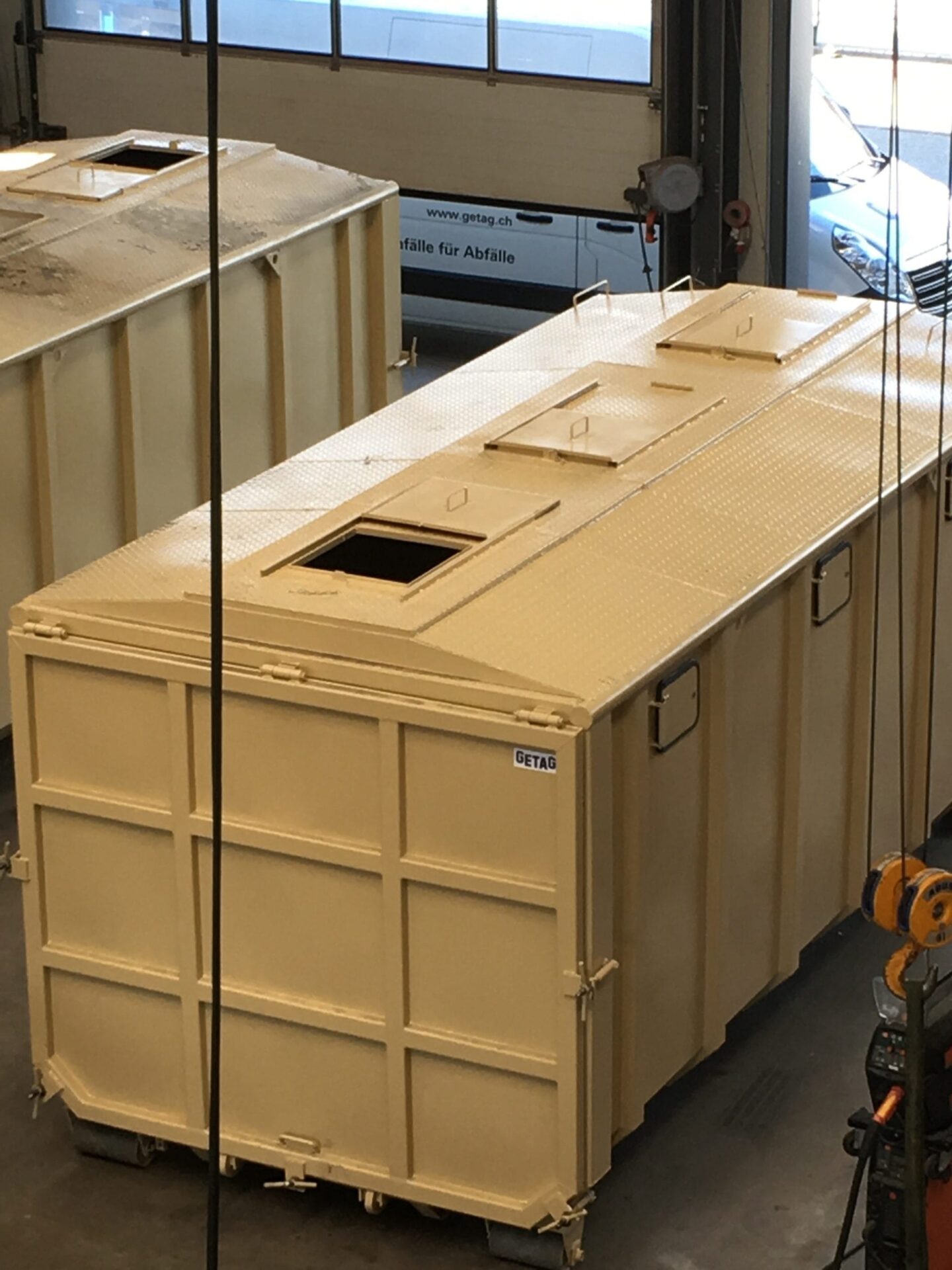 En mai 2017 nous avons eu le plaisir de livrer à l’entreprise Perlen Papier SA, deux bennes multi-lifts d’un volume de 23 m3 pour la cendre de leur centrale d’énergie. Ces bennes seront chargées par un convoyeur à chaines et c’est pour cela que les bennes sont équipées d’un toit fixe avec trois ouvertures à couvercle coulissant. Le niveau de remplissage va être contrôlé par les clapets de services. Pour un placement simple sur place, les bennes sont équipées avec deux rouleaux de manœuvre supplémentaires.