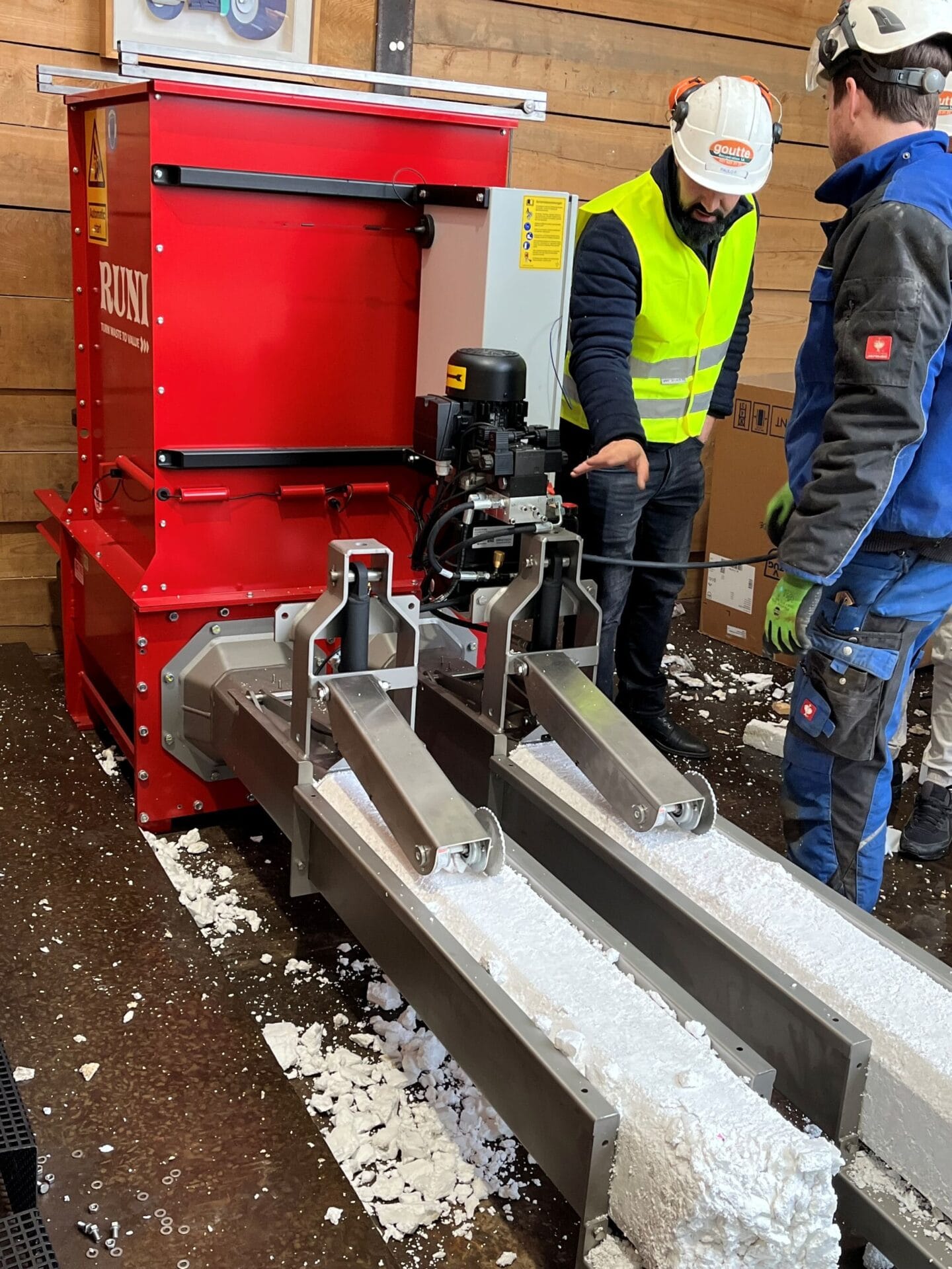 Unser Kunde Groupe Goutte hat in seiner Niederlassung in Echandens seine bisherige Styropor-Verdichtungsmaschine durch eine RUNI SK200 TWIN ersetzt und zeigt sich äussert zufrieden mit dem Ergebnis. Das zu verarbeitende Material kann schnell und einfach verdichtet werden.