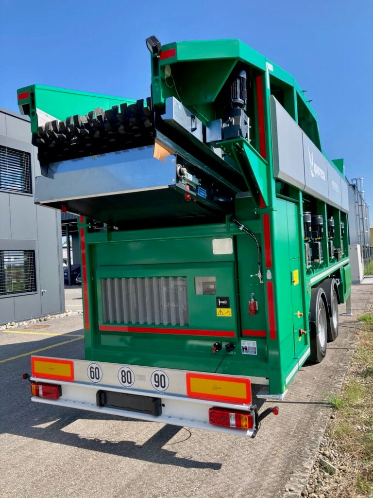 Der Materialaufgabebunker ist so konzipiert, dass dieser von beiden Seiten beladen werden kann. Somit ist die Maschine flexibel auf jedem Platz einsetzbar. Die Materialien wie Kompost, Gärgut und Humus können mit dem 3-Fraktionen Sieb in die gewünschte Korngrösse (Grobfraktion: >60…90 mm, Mittelfraktion: 10…25-60…90 mm, Feinfraktion: >0/10…25 mm) gesiebt werden.