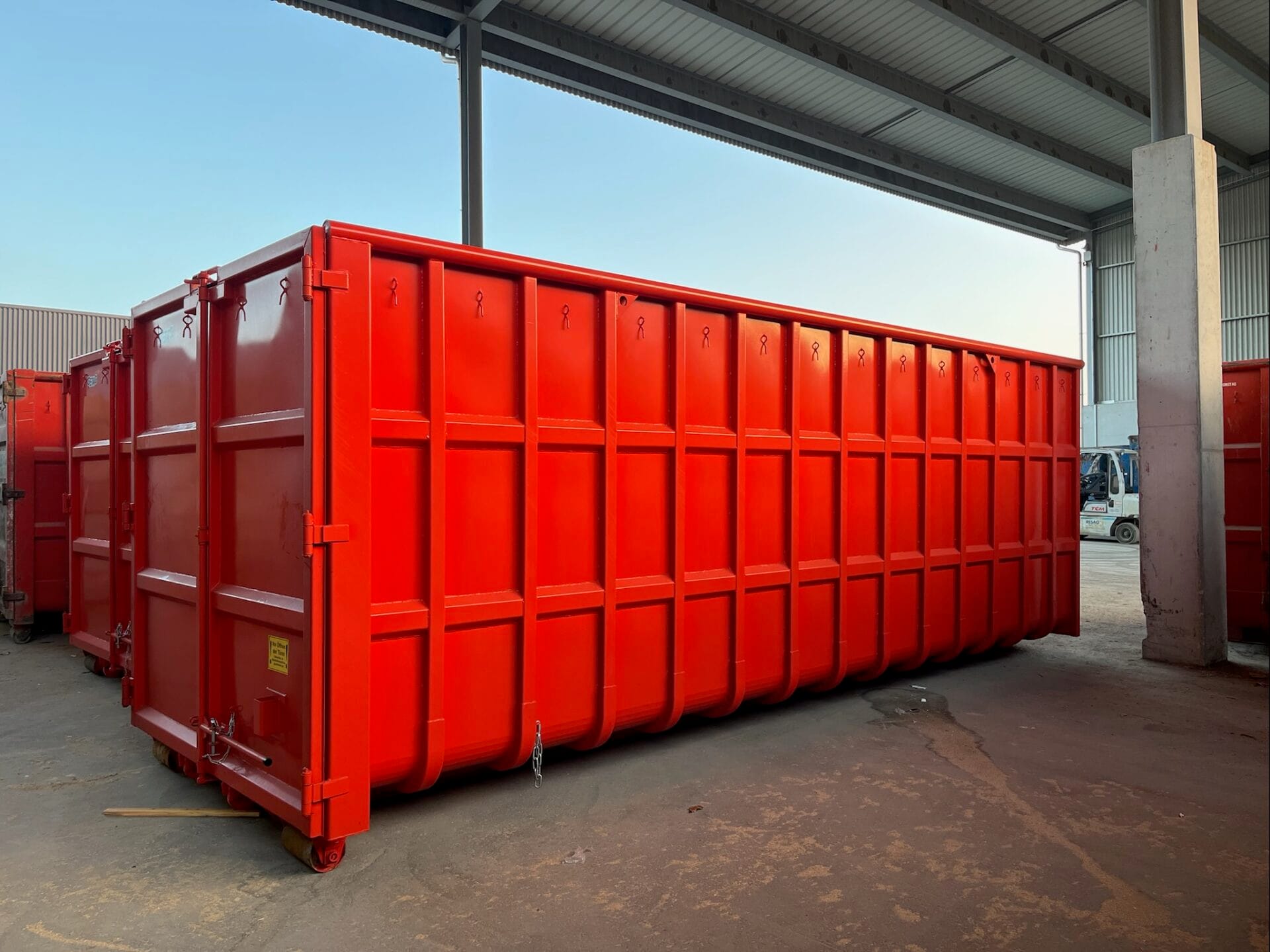 Auf Kundenwunsch können unsere Standardbehälter zusätzlich verstärkt werden. Hier ein Beispiel eines Abrollcontainers mit Vertikalspanten in kürzeren Abständen und zusätzlich zwei Horizontalspanten. Dadurch wird die Stabilität verbessert und die Lebensdauer des Containers verlängert.